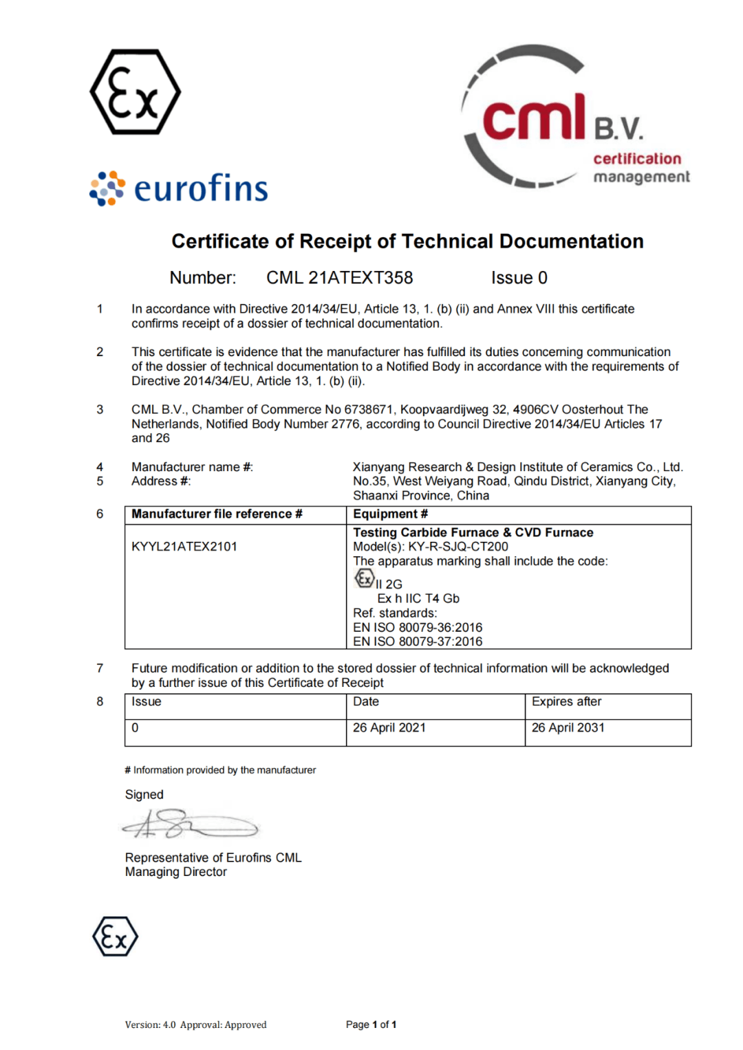 4月26日,歐陸(Eurofins)集團向咸陽陶瓷院頒發了氣相沉積CVD實驗爐ATEX防爆認證書,這是中國首個碳化和化學氣相沉積實驗爐系統的防爆ATEX證書,標志著我國國內碳化和化學氣相沉積設備在硅碳材料行業的設計安全水平跨入到了全新的歷史階段,已達到國際安全設計水準。